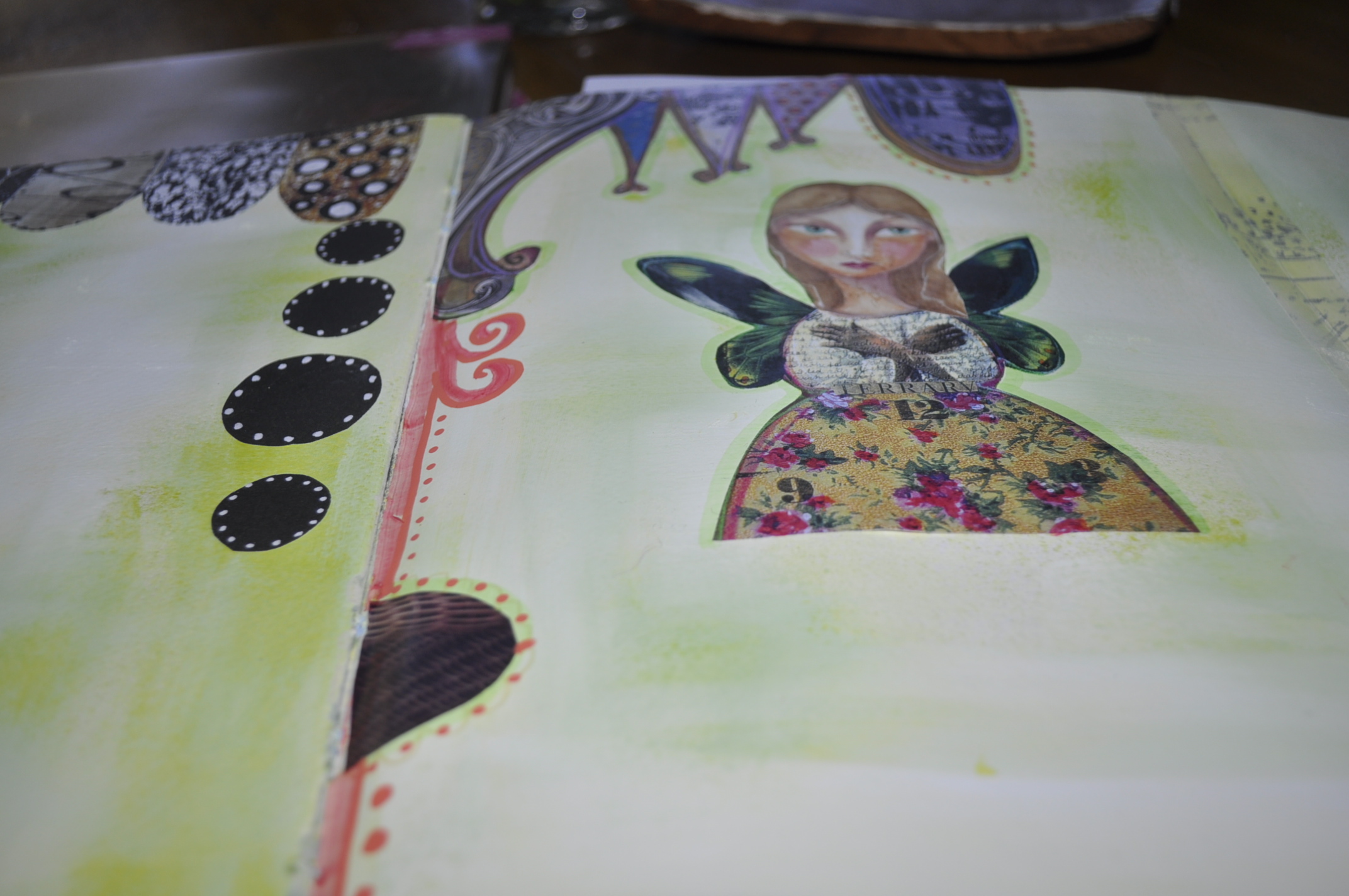 I have also been taking Kelly Kilmer”s, Making my Mark monthly collage art journal class. Somewhere along the way I hope to develop a style of art journaling of my own.